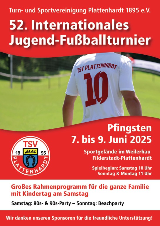 Auf unserer Homepage www.tsvplattenhardt.de finden Sie weitere Informationen zu unserem Pfingstturnier.
